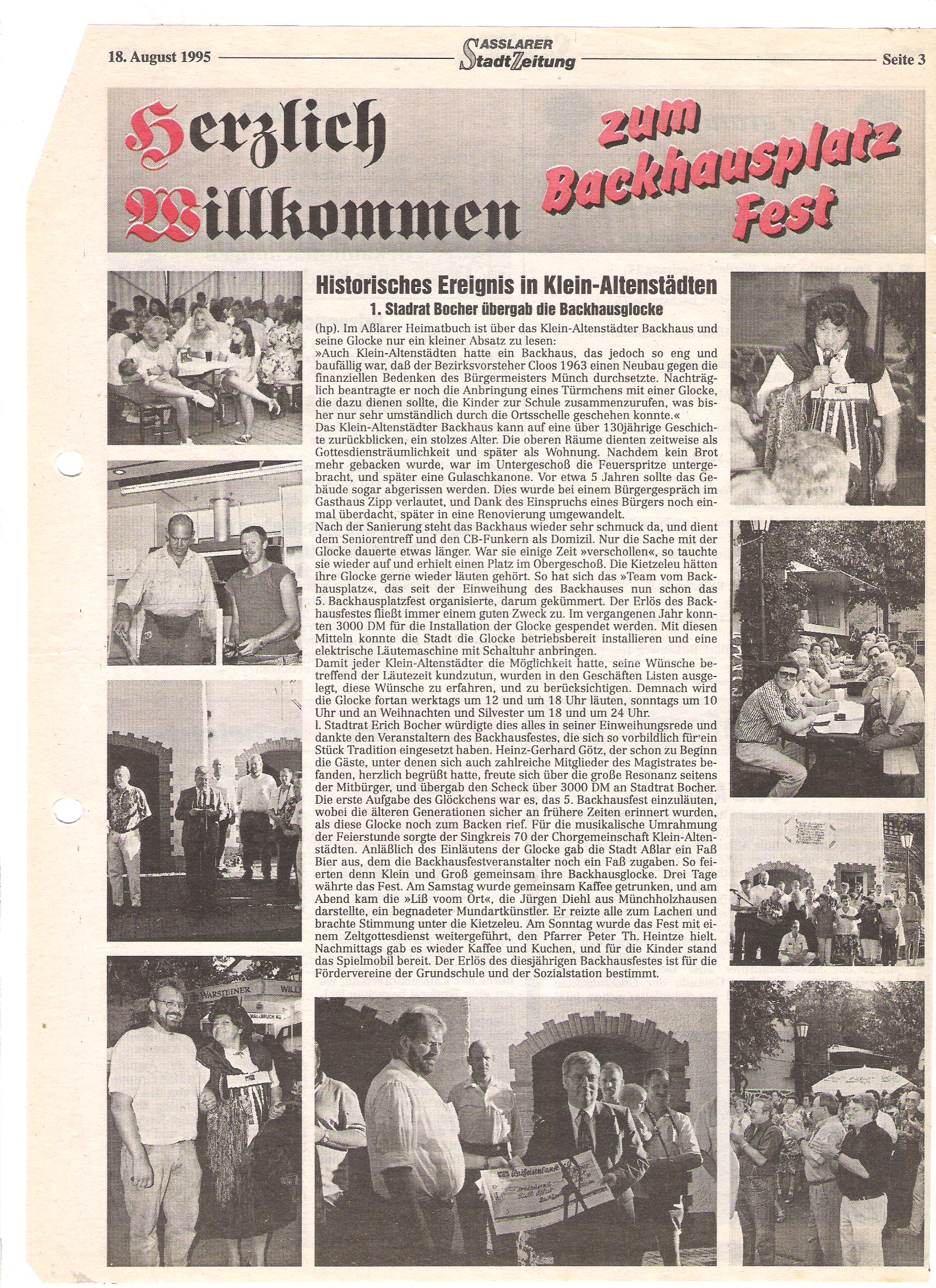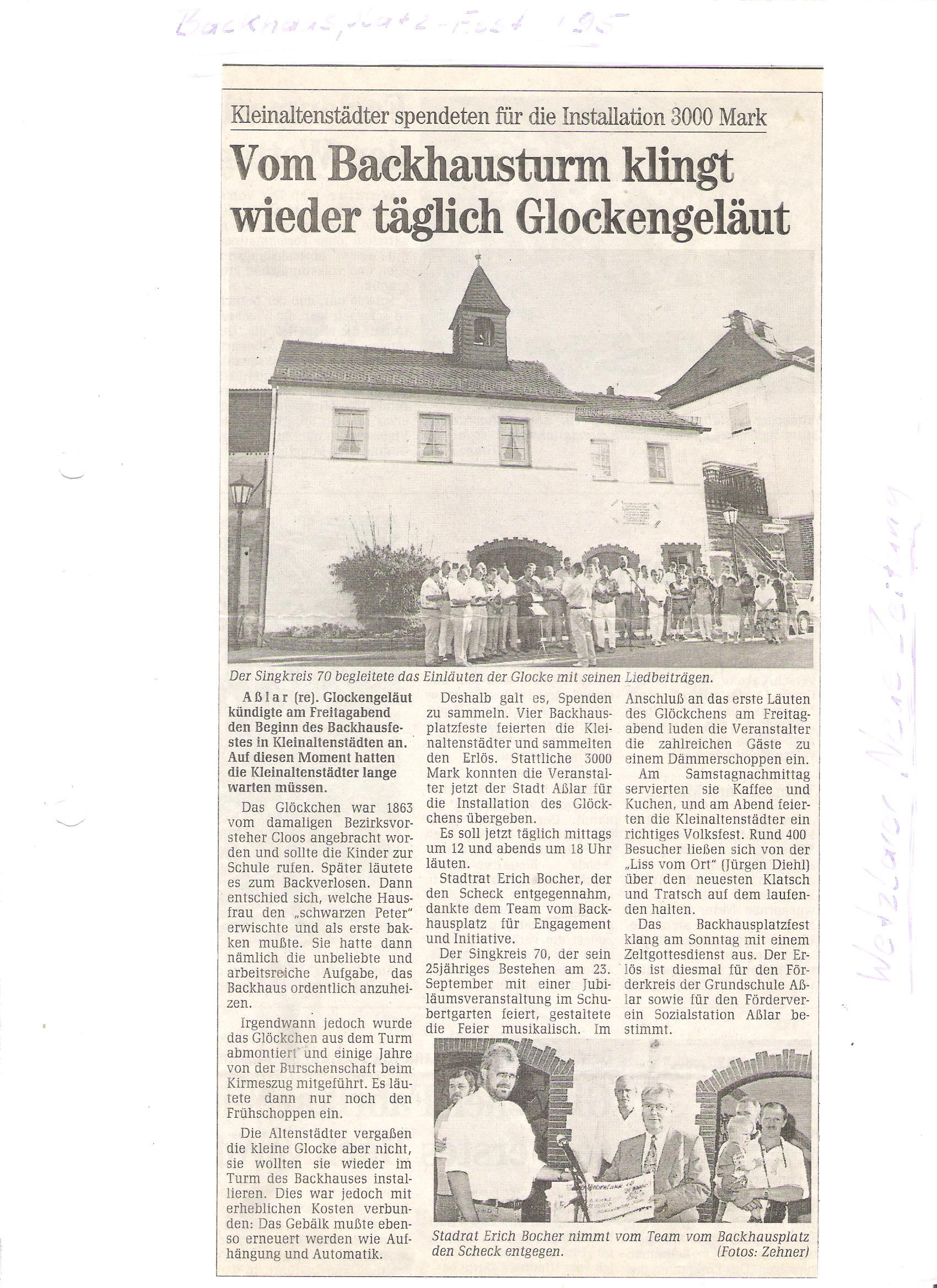5. Backhausplatzfest 1995 Posted on 21. Februar 2015 by Tim Götz Bei unserem 5. Backhausplatzfest erhielt das Backhaus in Klein-Altenstädten feierlich seine Glocke im Glockenturm zurück.