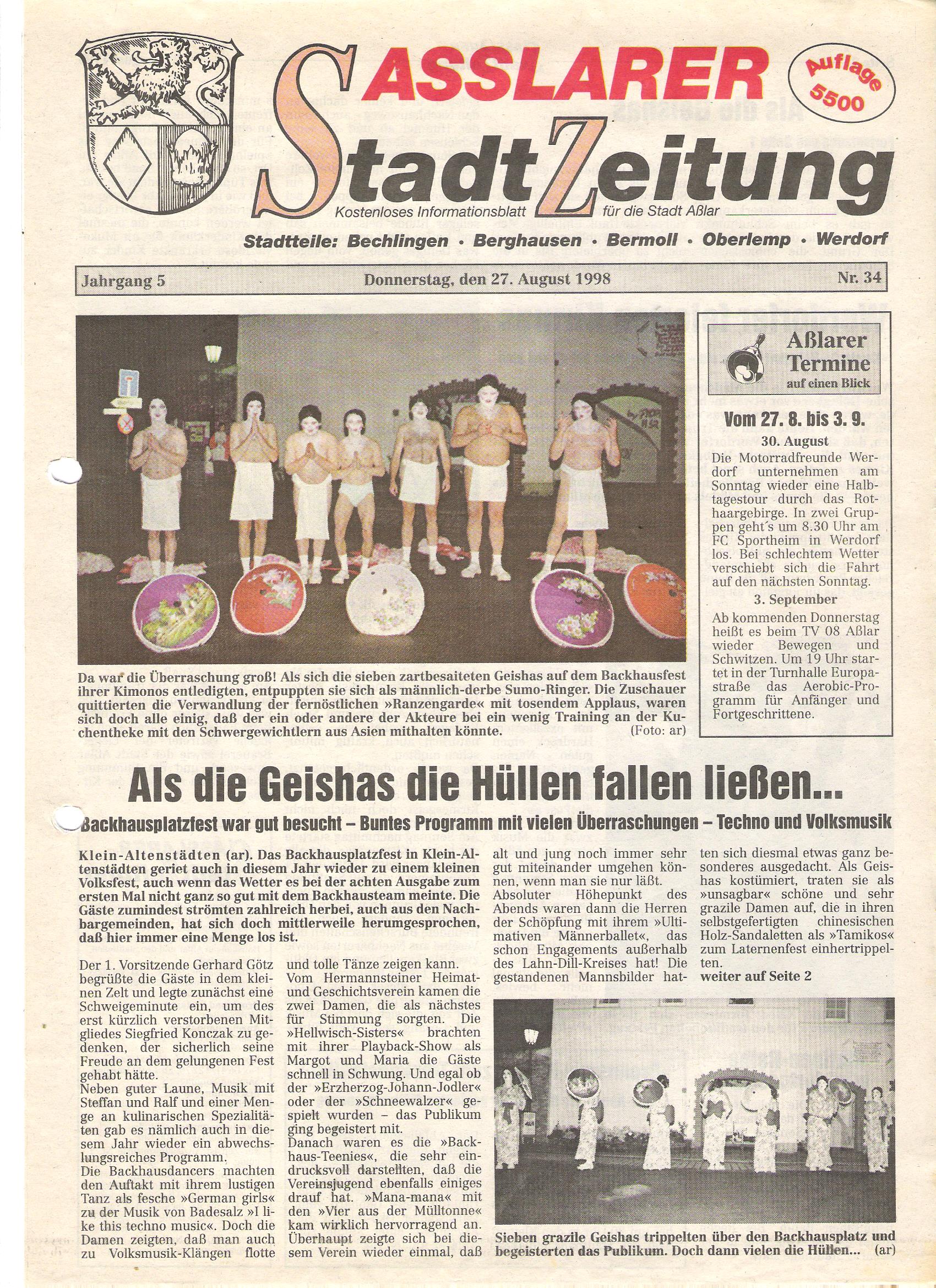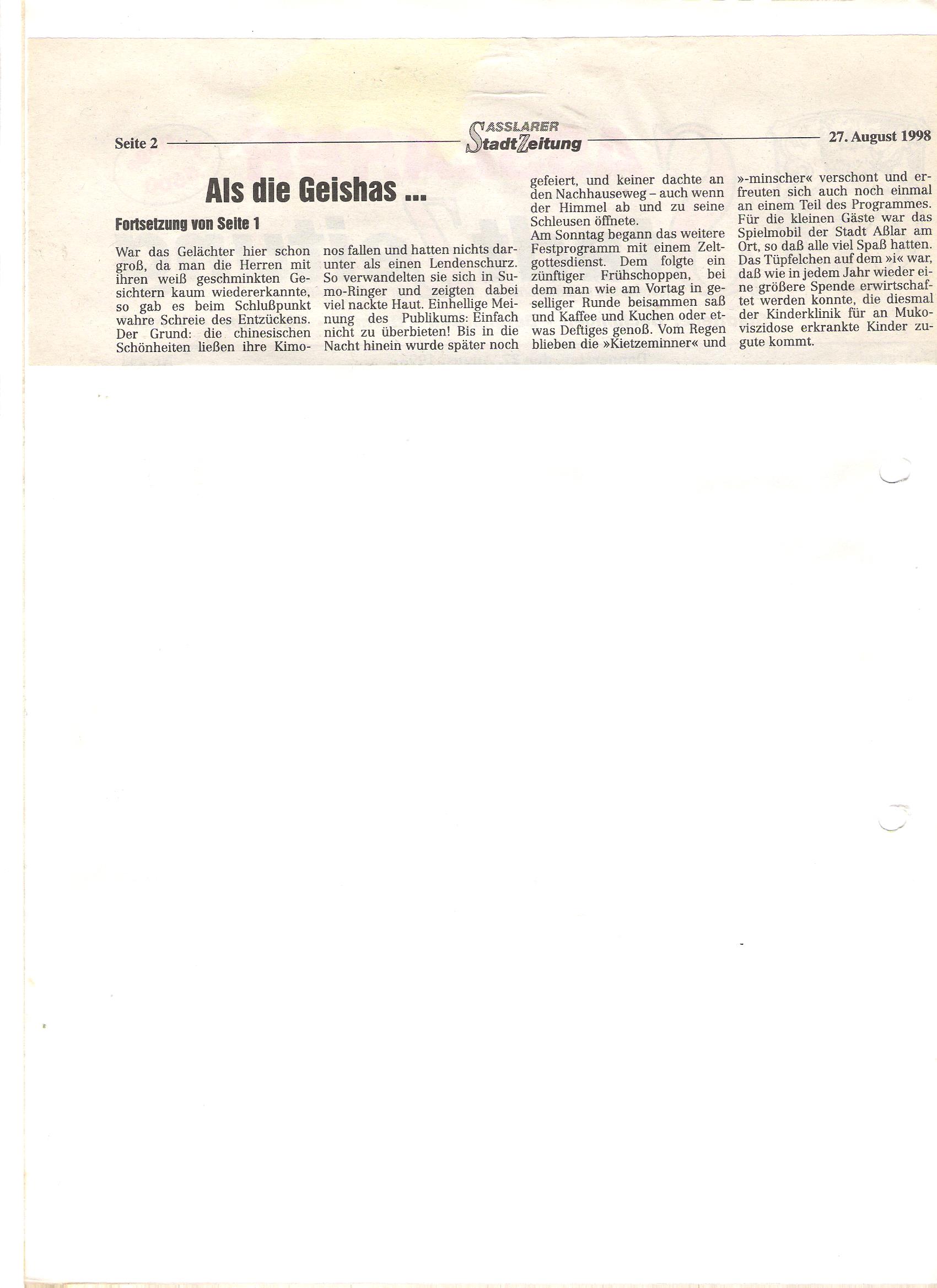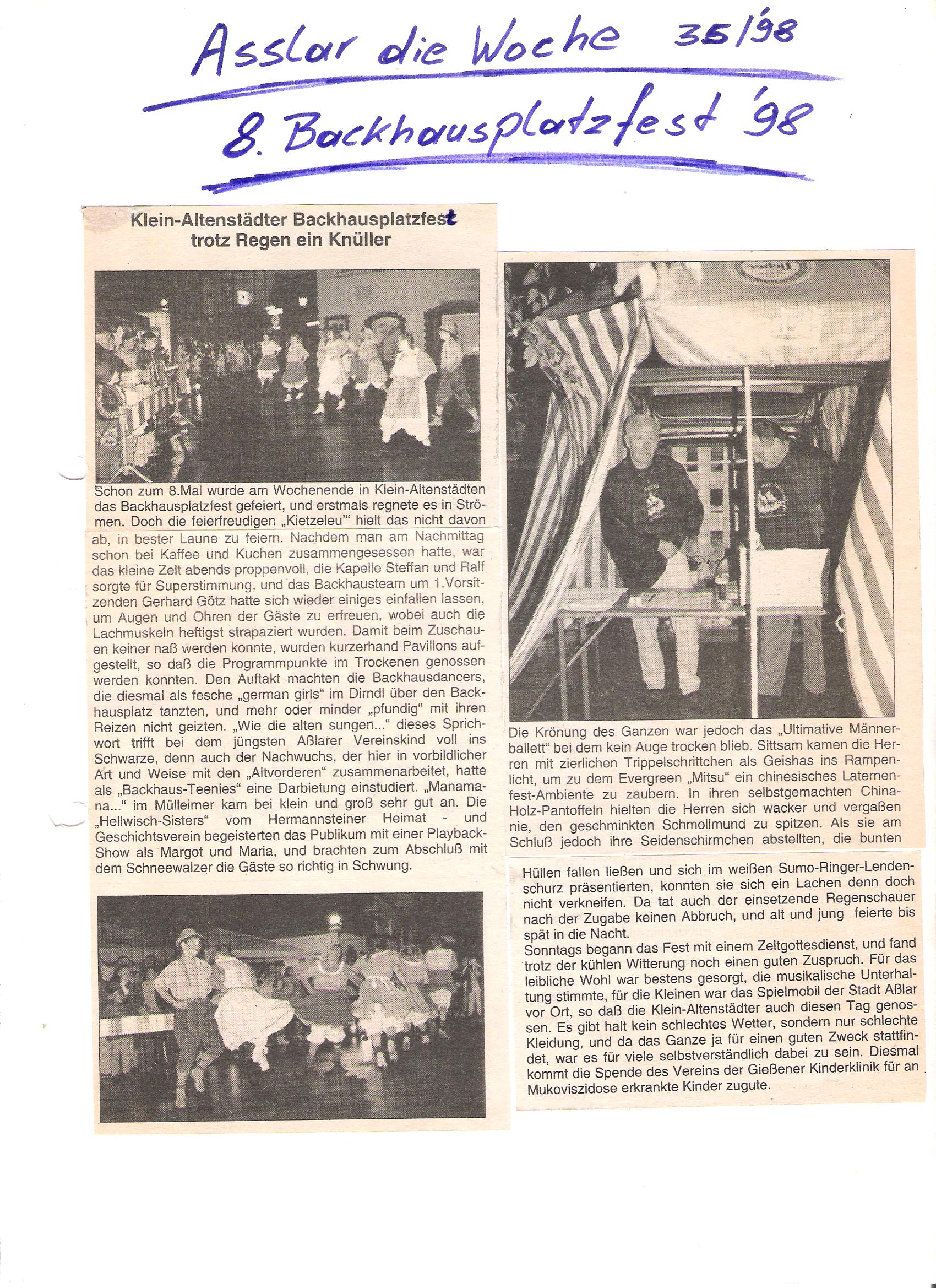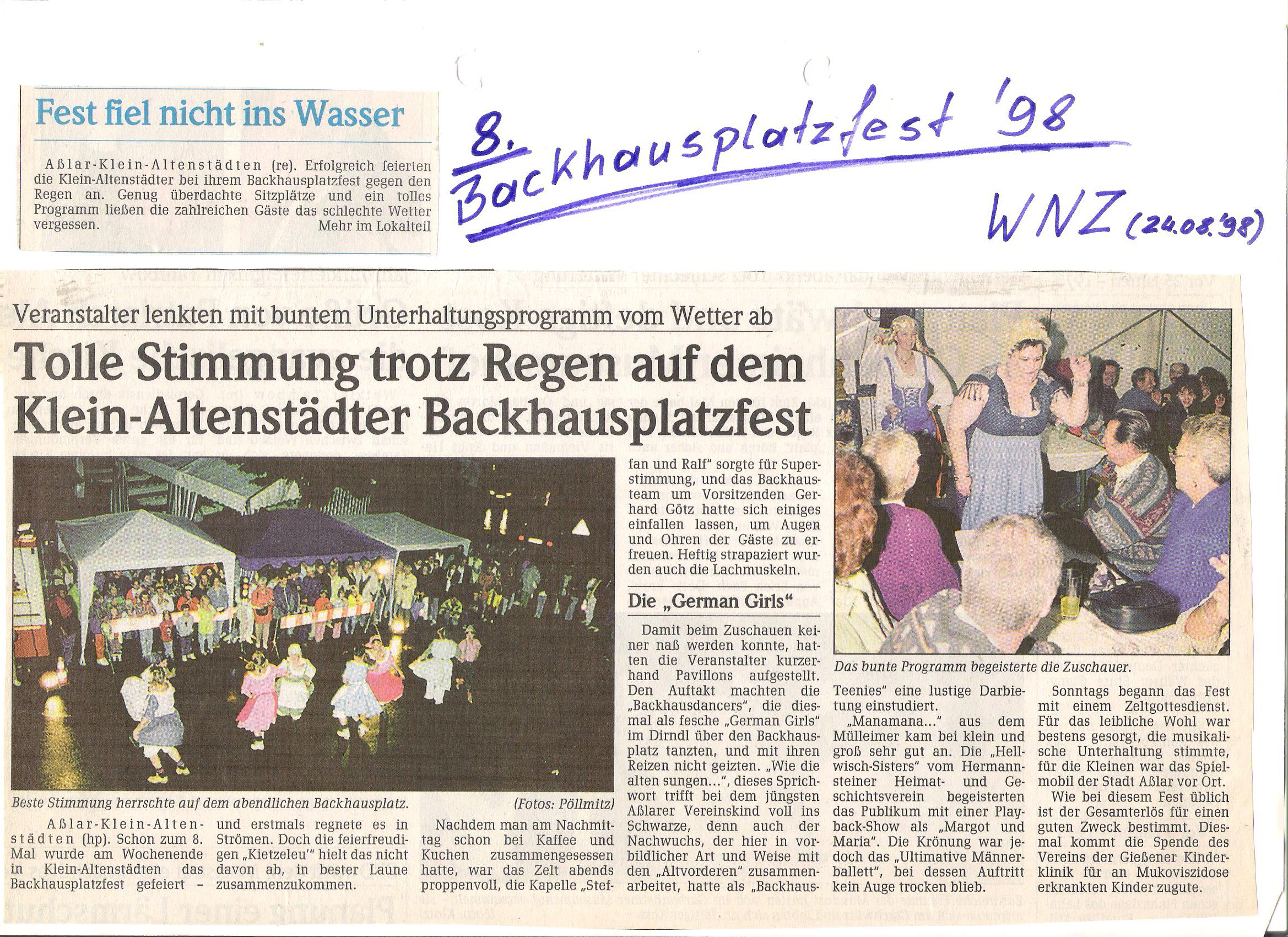 Das 8. Backhausplatzfest wurde trotz starkem Regen im Jahre 1998 gefeiert, die Gäste des Festes spendeten großen Applaus als sie bei den Tanzdarbietungen die Vier aus de Tonn, die German Girls und den Geishas am Straßenrand standen.