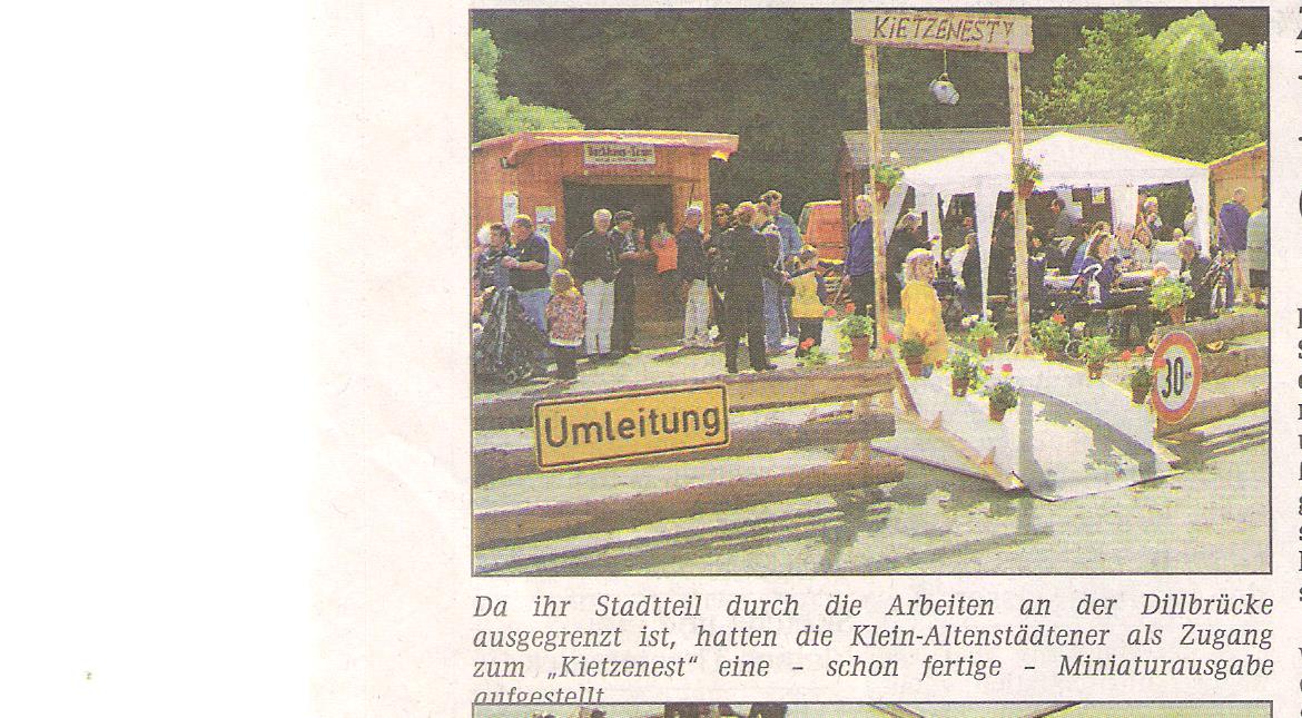1. Stadtfest 2000 Posted on 21. Februar 2015 by Tim Götz Beim Stadtfest 2000 fand man unseren Verein im Kietzenest über die mit Blumen geschmückte Nachbildung der Dillbrücke gelangten die Besucher zu den Ständen der Klei-Altenstädtener Vereine.